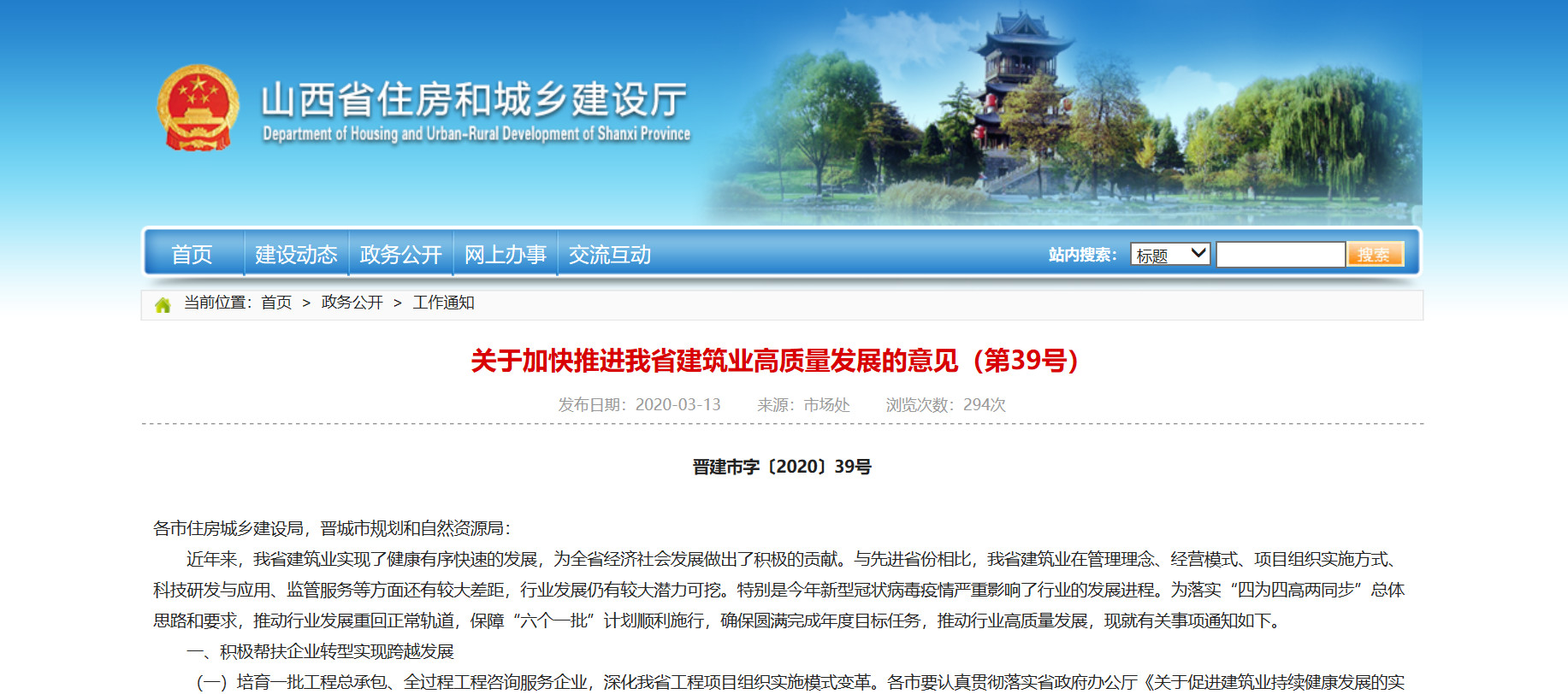 2020年3月13日,山西省住房和城鄉建設廳發布了《關于加快推進我省建筑業高質量發展的意見 》晉建市字〔2020〕39號,文中強調: