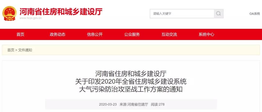 2020年3月23日,河南省住房和城鄉建設廳關于印發《2020年全省住房城鄉建設系統大氣污染防治攻堅戰工作方案》的通知,內容強調: