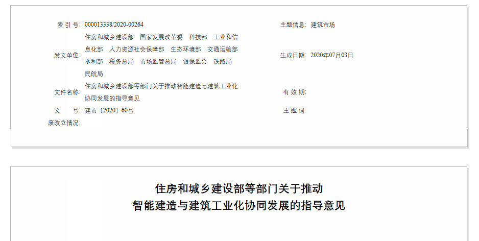 住房和城鄉建設部等部門關于推動 智能建造與建筑工業化協同發展的指導意見